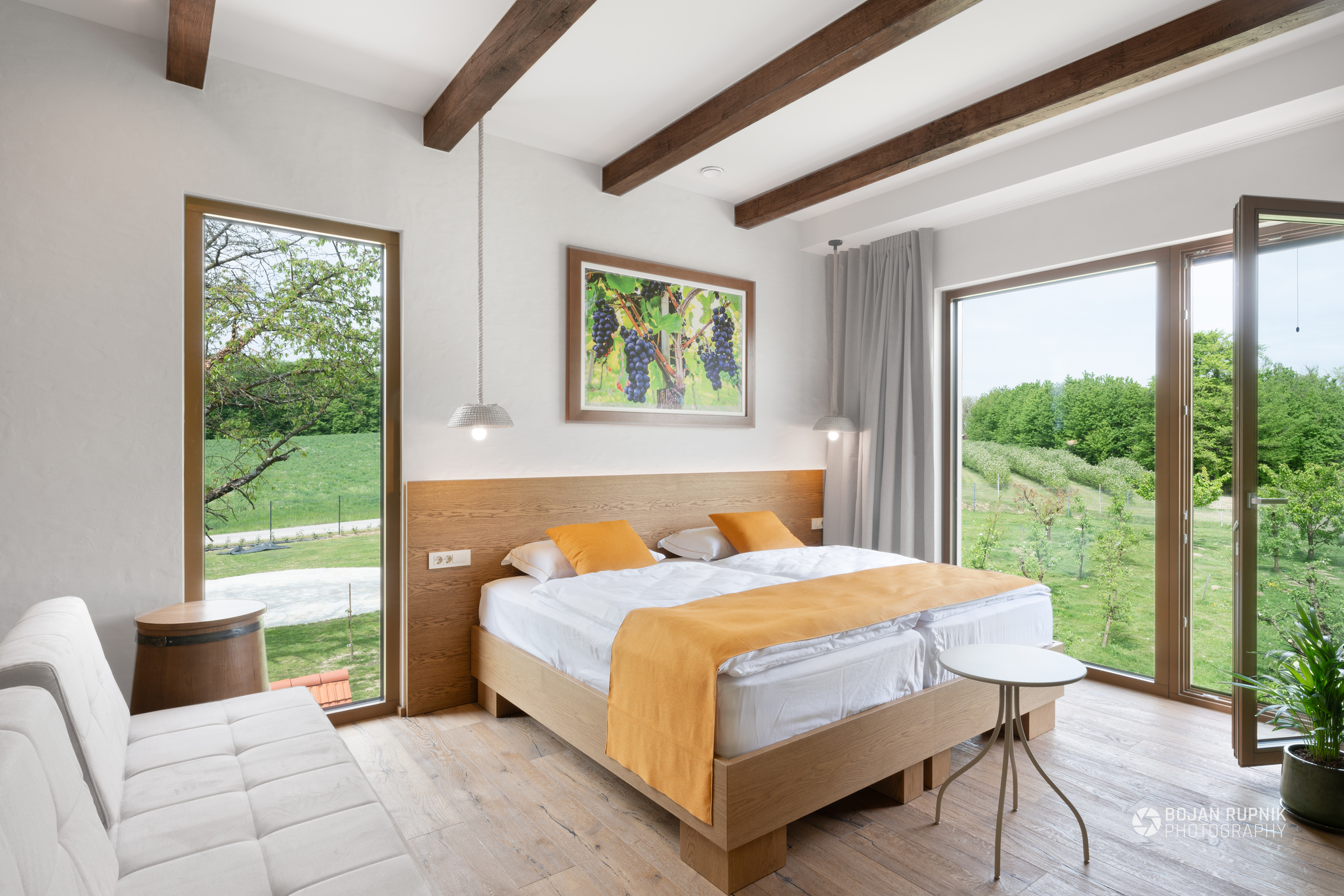 Prostornost in svetloba sta v ospredju. Kot nekoč skedenj, danes soba navdahne s svojo zračnostjo, preprostimi linijami in svetlimi toni. Prostor za umiritev duha in razglede – na vinograde Ljutomersko ormoških goric.